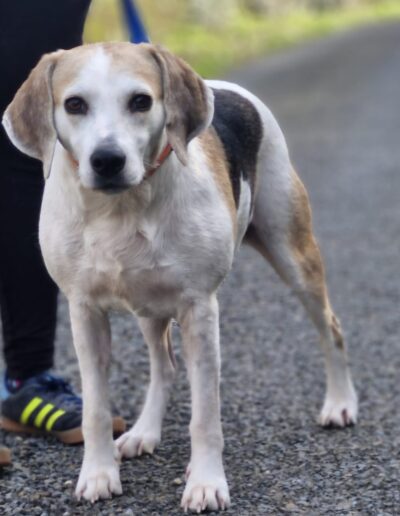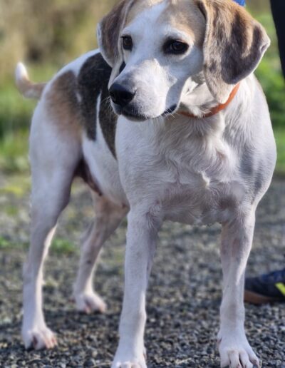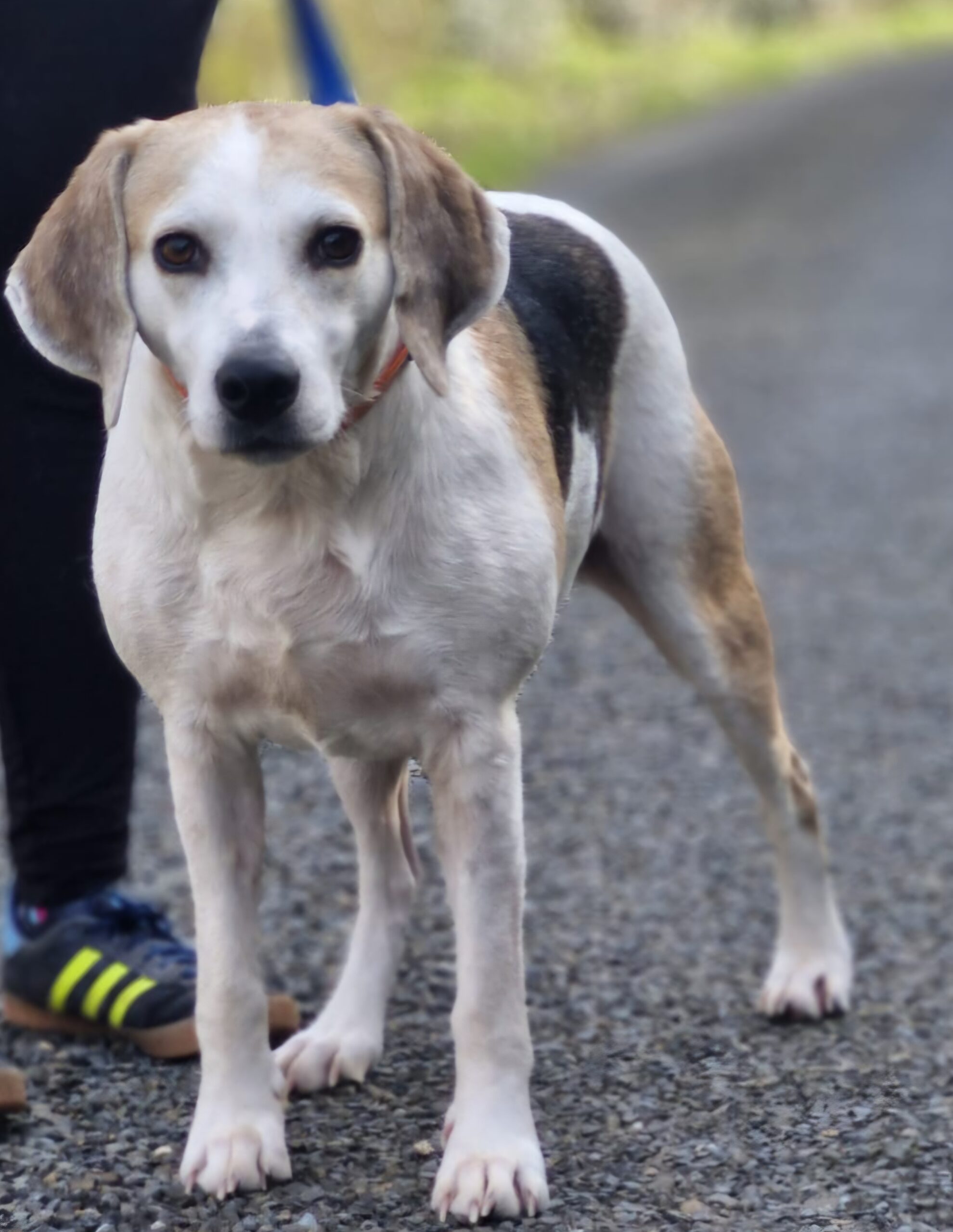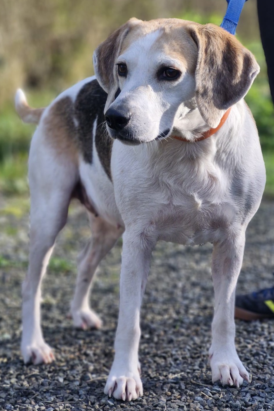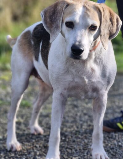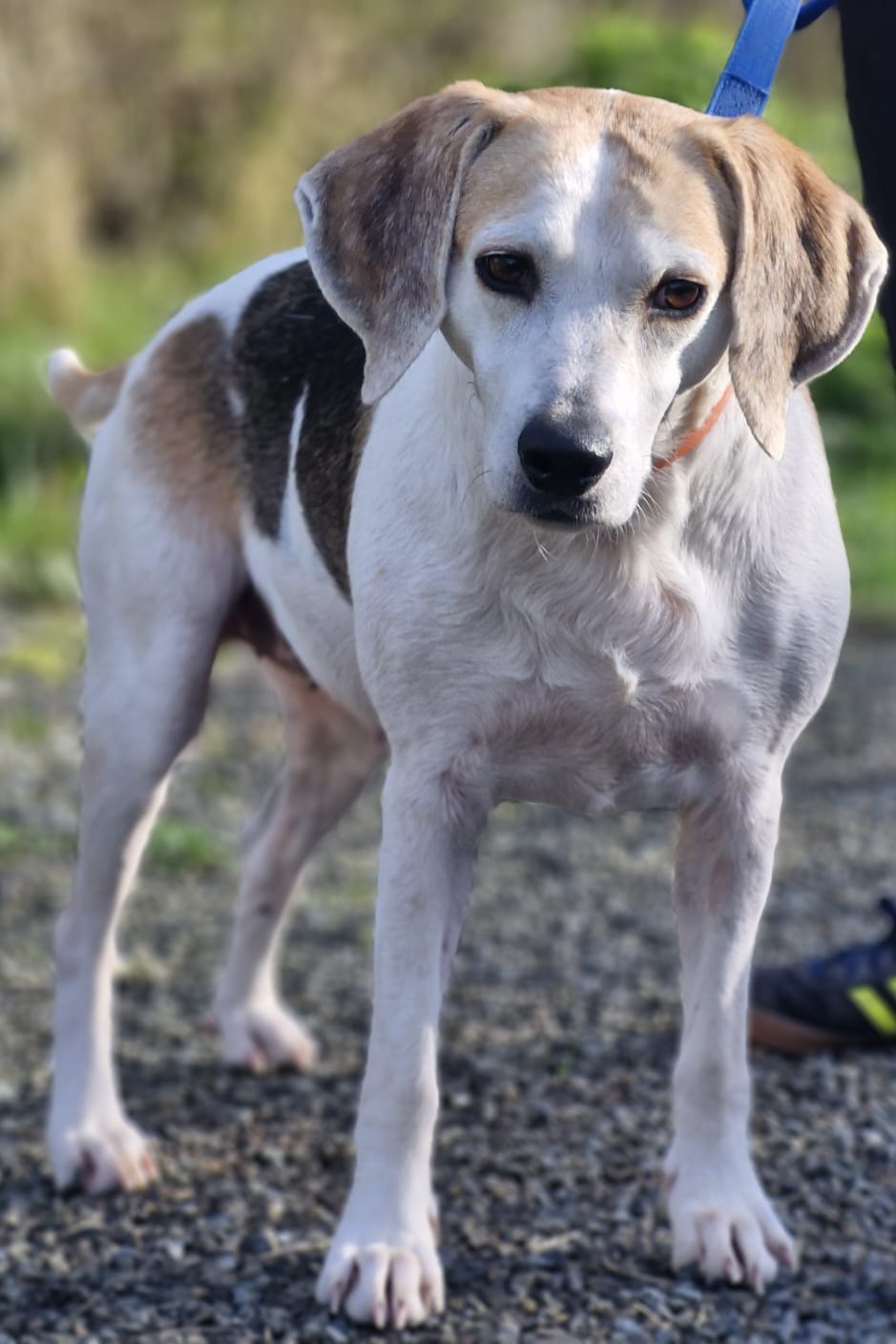 Mandy came into our care on the 18/1/2026, she was found straying in the countryside with no chip and no one ever came looking. She is a hound / beagle and is roughly around 5 years of age and is a beautiful tri – colour