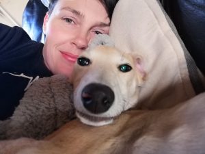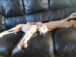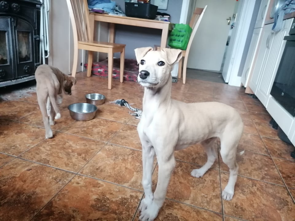 He’s now a very happy and healthy boy, who is happiest when he is being snuggled and lazing on the sofa. He’s got his little buddy, Bluey, a fellow foster puppy, to play with. They have lots of fun racing about the garden playing with toys and balls and he is curious about everything. Looking at him now, you would never believe he was the same weak, scrawny pup who arrived in January. He’s very good with other dogs and is learning all his good dog manners from Amy’s three dogs. This is why foster homes are vital for rescue puppies so they don’t miss out on all their early life lessons of socialising and dog body language to help make them grow into well rounded dogs. He’s learning about walking on the lead, it’s a slow process as he is not a big fan of it just yet but he’s improving and getting there. He’s almost house trained if the door is open he will go out but hasn’t quiet figured out to let Amy know when he needs to go out.